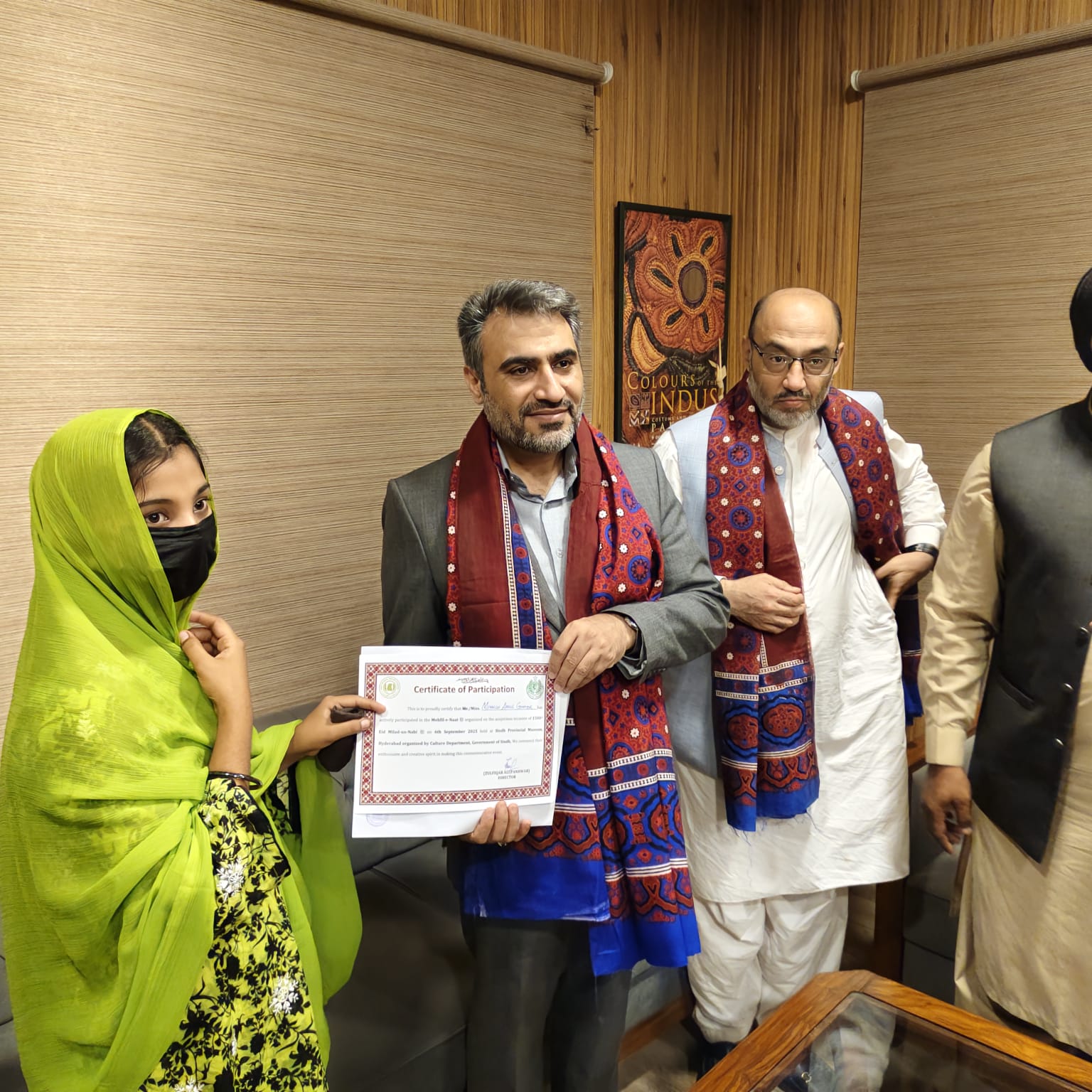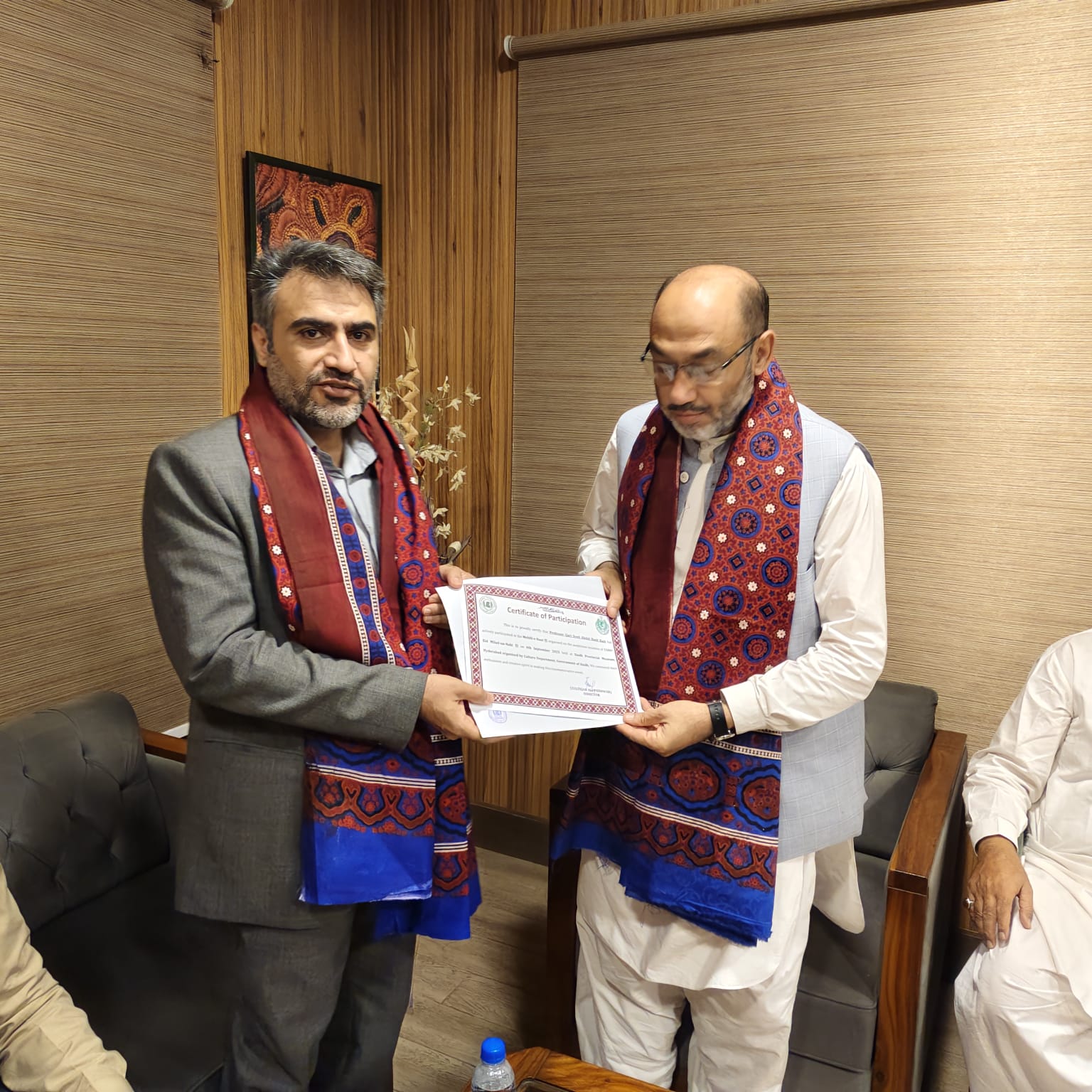 پروگرام کے بعد ڈائریکٹر سندھ میوزیم جناب ذوالفقار پنھور کے دفتر آفیس میں تمام نعت خواں کو سرٹیفکیٹ دیا گیا اور رضا پارسا صاحب کو سندھ کی ثقافت اجرک کا تحفہ دیا گیا ۔۔