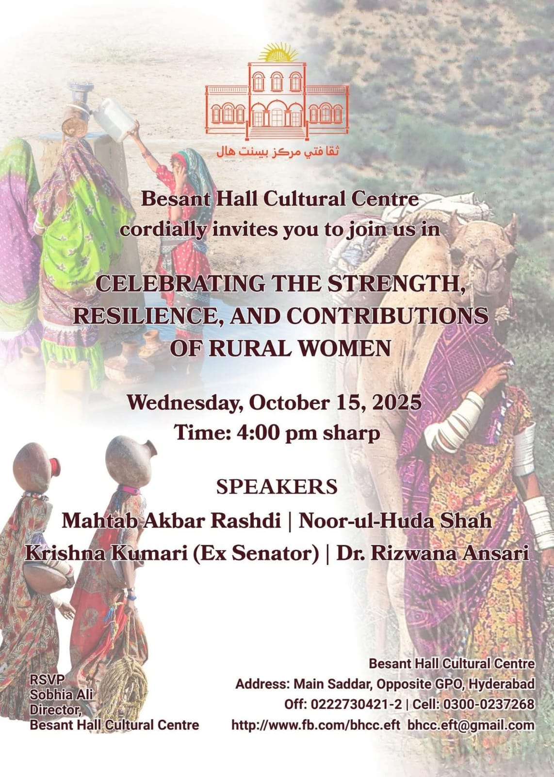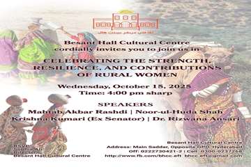 ​بسنت ہال کلچرل سینٹر نے عالمی یومِ دیہی خواتین منایا گیا، جس میں ان خواتین کے محنت کو خراجِ تحسین پیش کیا گیا جو ہمارے کھیتوں، خاندانوں اور ثقافت کو سنبھالتی ہیں۔ ​اس پُر وقار تقریب کی زینت بننے والی معزز شخصیات میں سابق سینیٹر مہتاب اکبر راشدی، سابق سینیٹر کرشنا کماری، نورالہدیٰ شاہ، ڈاکٹر رضوانہ انصاری، ڈاکٹر فاطمہ حسن، کمشنر حیدرآباد فیاض حسین عباسی، ای ایف ٹی کے ٹرسٹی شمس الحق میمن، اور ایران کے کلچرل اتاشی (کراچی -حیدرآباد) ڈائریکٹر خانہ فرھنگ جمھوری اسلامی ایران-حیدرآباد رضا پارسا اور کئی دیگر نامور شخصیات شامل تھیں۔ ​اس موقع کی حقیقی طاقت شہداد پور سے آئی دیہی خواتین نے بڑھائی، جنہوں نے تقریب میں شرکت کی اور کھیتوں اور زرعی زمینوں پر کام کرنے والی خواتین کے طور پر اپنے عملی تجربات بیان کیے۔ ​شام کا اختتام نوجوان خواتین لوک گلوکاروں کی جانب سے "شاہ جی وائی" کی دل کو چھو لینے والی پرفارمنس سے ہوا، جو سندھ کی بیٹیوں کے جذبے کی عکاسی کر رہی تھی۔